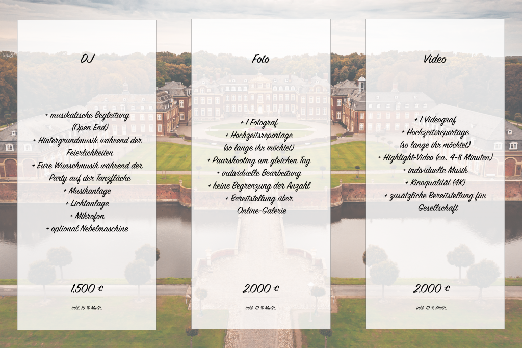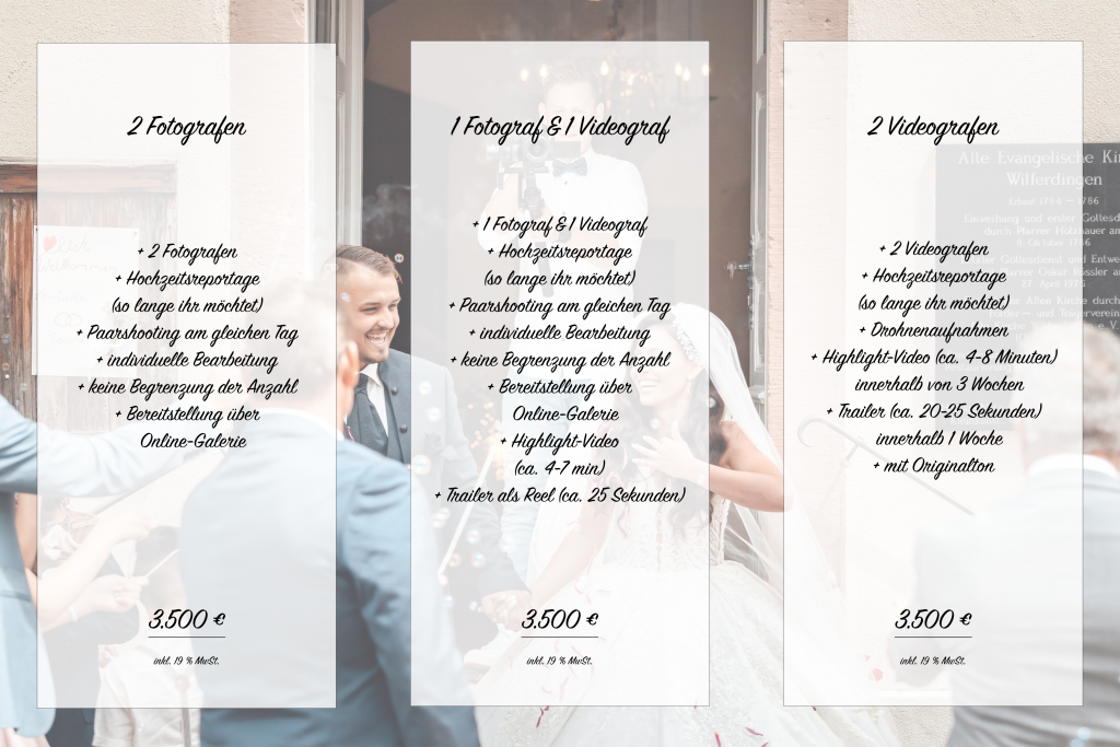 Aus diesem Grund verstehen sich all unsere Paket-Preise als Pauschalen. Es kommen keine weiteren Kosten für spontane Verlängerungen oder Anfahrten auf Euch zu. So könnt ihr ohne versteckte Kosten entscheiden, ob wir Euch begleiten dürfen.